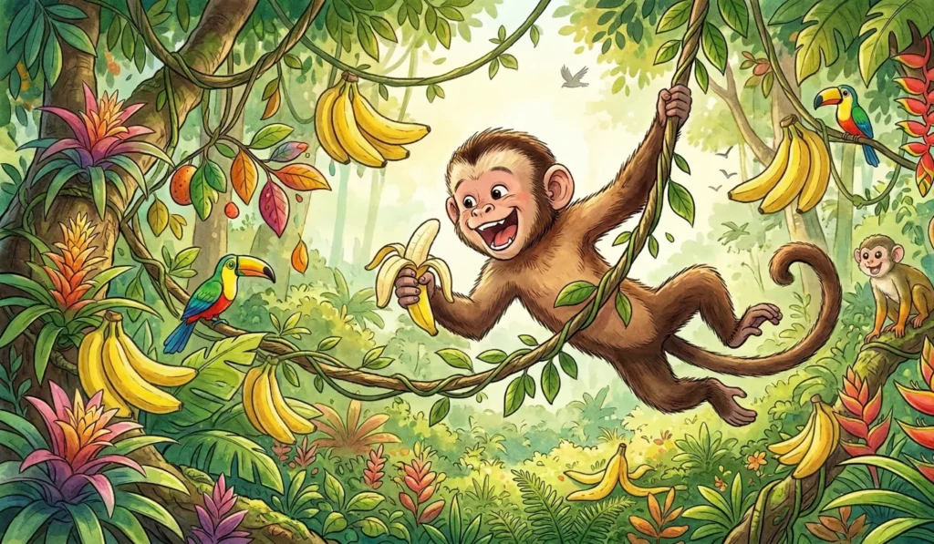 Era uma vez um macaco muito levado. Ele gostava muito de comer banana e brincar na árvore.